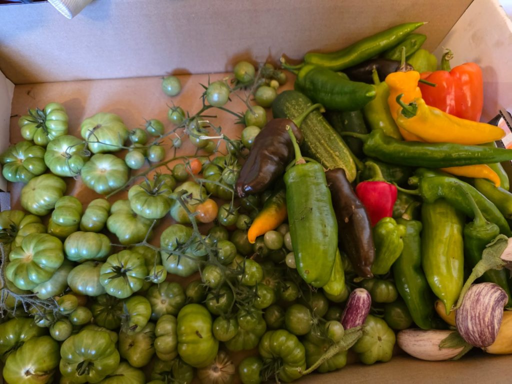 Tänä vuonna sato ehti hyvin kypsymään. Vain pieni määrä tomaatteja ja paprikoita jäi raa´aksi ja ne tuotiin sisälle jälkikypsymään.